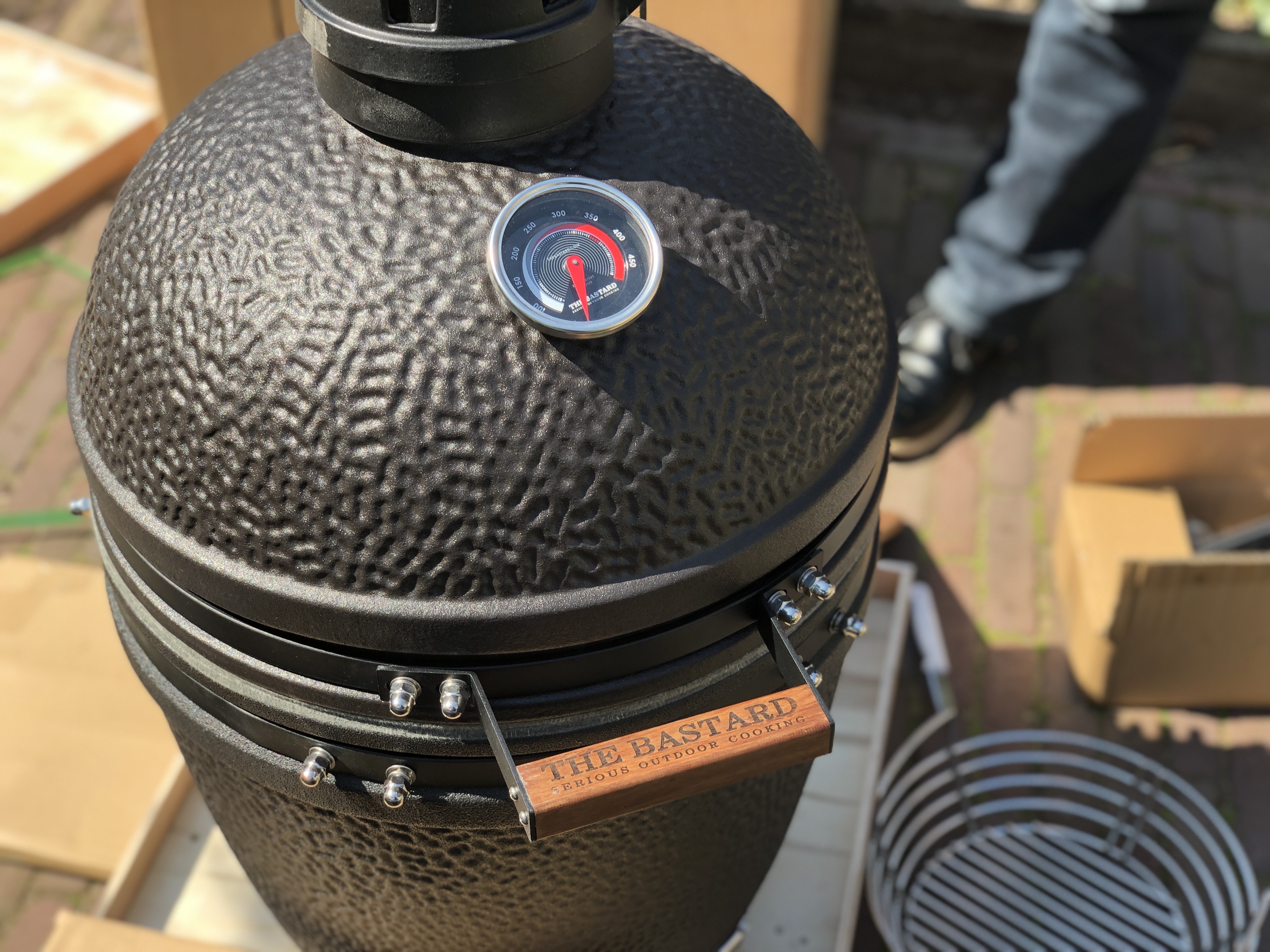 Na het unboxen is het zover: sleutelen. De tools die je nodig hebt die levert Bastard erbij. Geen zorgen je hoeft niet de schuur in om die gereedschapskist te zoeken. Het gegeven is goed te doen. Je maakt het onderstel door te starten met die mooie wieltjes. Vanuit het onderstel knutsel je door naar het geheel waar je de keramieken BBQ in laat zakken. Dat moet je absoluut met zijn tweeën of meer doen, want als keramiek op de grot klapt is het kapot. Echt makkelijk is het tillen niet. Half met je hand in een asgat (dat klinkt vies) en de andere op het scharnier waar je de BBQ mee opent, tellen tot drie en vanuit je r…. AU! KRIJG TOCH DE GIF&^%&%EM! Je moet wel tegelijk tillen en de BBQ niet naar je toe trekken zodat de ander bijna in het krat ligt waar het in werd vervoerd. Neem je tijd mensen, als die prachtige zwarte parel valt, dan is het huilen.