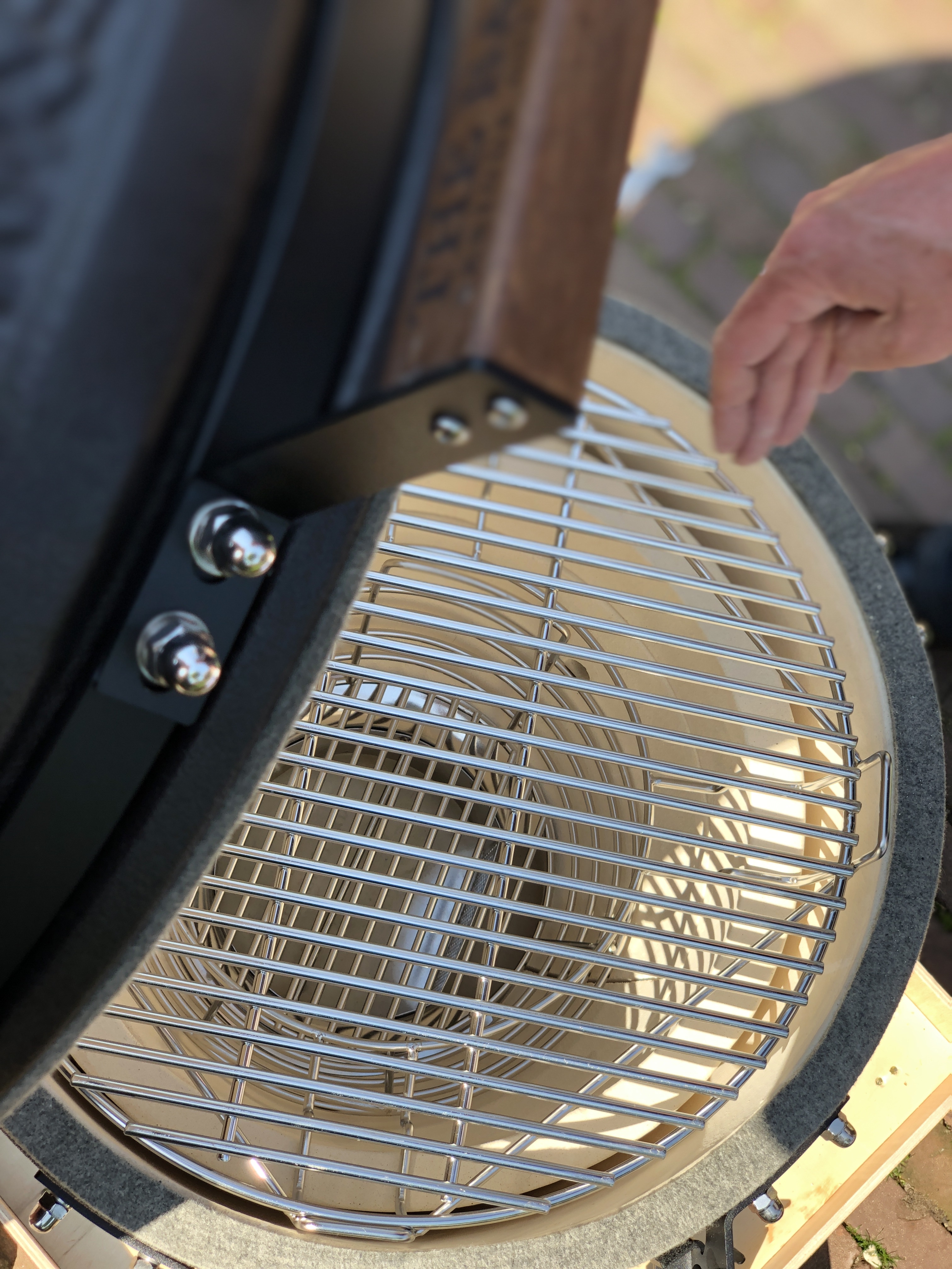 Hey! Het rooster is anders. Gelukkig want ik had een oneindige ruzie met het vorige systeem. Ik zal het even kort toelichten. Je had een grillrooster dat eigenlijk uit twee delen bestond en dat je met een scharnier kon openen, optillen, maar dat zal eigenlijk altijd los en viel dan halverwege uit elkaar. Ook was het helemaal niet nodig, want wie moet in Naam der Kamado Goden een Kamado bijvullen? Die ram je toch lekker vol en wat overblijft dooft en is bruikbaar volgende keer. Nee, ik ben blij met het nieuwe dikkere rooster zonder opstaande randjes uit één stuk.