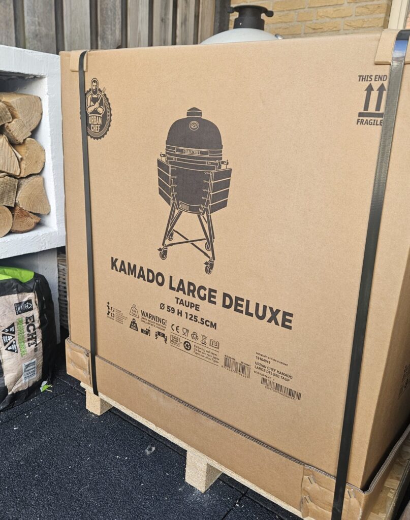 Zo! De Kamado staat na wat getrek en gesleep in de achtertuin en dan kunnen we natuurlijk niet wachten met unboxen. Ik ben heel benieuwd naar hoe de kleur er buiten uit zal zien. In de showroom is het toch net even anders dan in zonlicht, en we hebben het zonnetje mee dus kan ie gelijk shinen in de eerste lente zonnestralen! Maar goed ik droom even weg met het eind doel. Eerst maar eens de omdoos simpelweg omhoog er afnemen en dan is de Kamado voor het eerst echt te zien. Welliswaar goed ingeseald om heelhuids aan te komen, maar de eerste indruk is nog steeds goed!