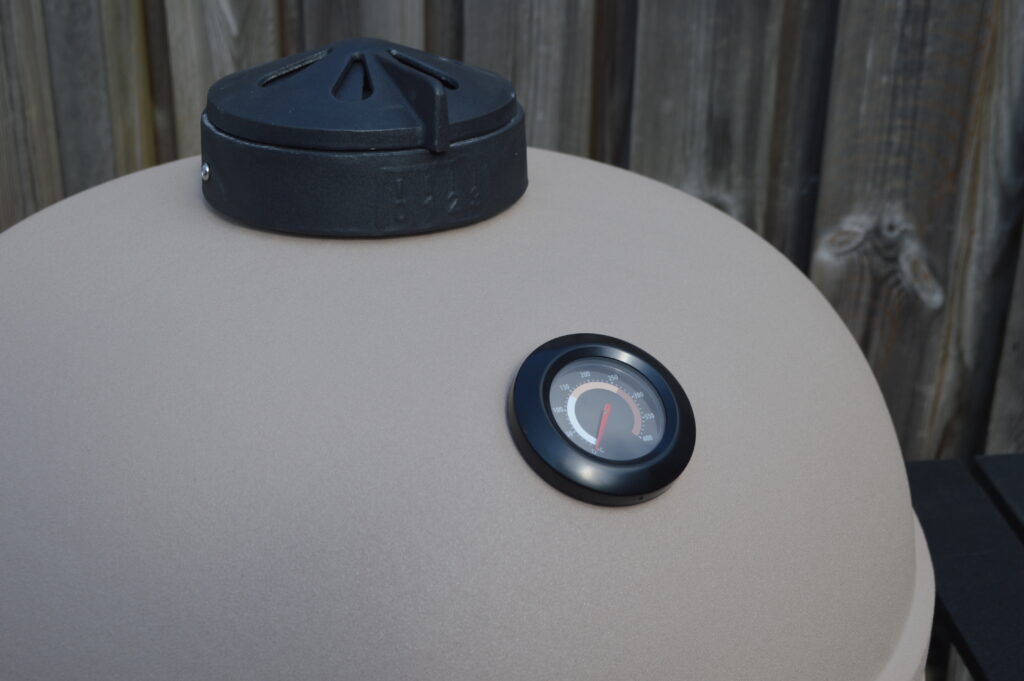 Ja zoals je zal merken is de eerste indruk helemaal prima! De kleur is natuurlijk wat als eerst opvalt, moet zeggen dat hij minder smaak gevoelig is dan ik verwachtte. Tijdens het testen hebben we uiteraard regelmatig eters over de vloer en niemand heeft gezegd dat ze de kleur niet mooi vinden en zélf vaker hoor ik dat ie mooier is dan zwart! Ik moet ook zeggen dat de combinatie van Taupe en zwart ook wel echt een goede is. Het geeft mooi contrast tussen de verschillende onderdelen. De topvent zou van mij een dakje mogen hebben voor het geval het mocht gaan regenen tijdens een grillsessie. Verder kan ik eigenlijk niets afkraken van deze Kamado!
