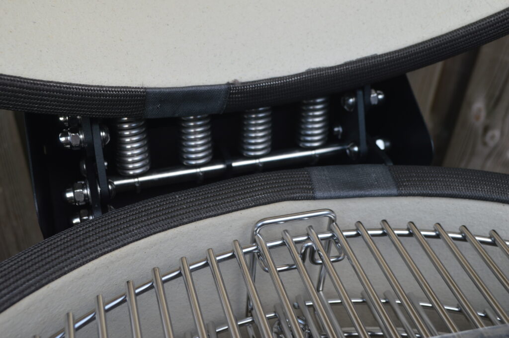 Wat ook niet onbenoemd mag blijven is de extra versteviging van het openingsmechanisme. Check op de foto in het midden, tussen de veren is een extra metalen plaat geplaatst om de pin die de veren op zijn plek houd 2 keer zo sterk te maken, wat er voor zorgt dat deze niet gaat buigen en dit heeft natuurlijk weer zijn positieve werking op het sluiten van de kamado en dus ook gelijk op de werking van het gehele apparaat. Zo kan een kleine aanpassing zeer grote gevolgen voorkomen. Klein detail, grote impact dus!