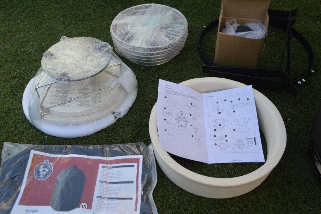Wanneer het onderstel klaar is mag er eindelijk aan de Kamdo gezeten worden. Het folie kan er af en de binnenkant halen we leeg, om de Dome zo licht mogelijk te maken voor het plaatsen in het onderstel. Wanneer we alles uit de Kamado halen merken we op dat werkelijk alles wat je nodig hebt om helemaal los te gaan op deze Kamado er bij zit. Een verdeelbare kolenmand, multi-level grill systeem, 2 halve hitteschilden, 2 halve en een heel grillrooster (RVS).