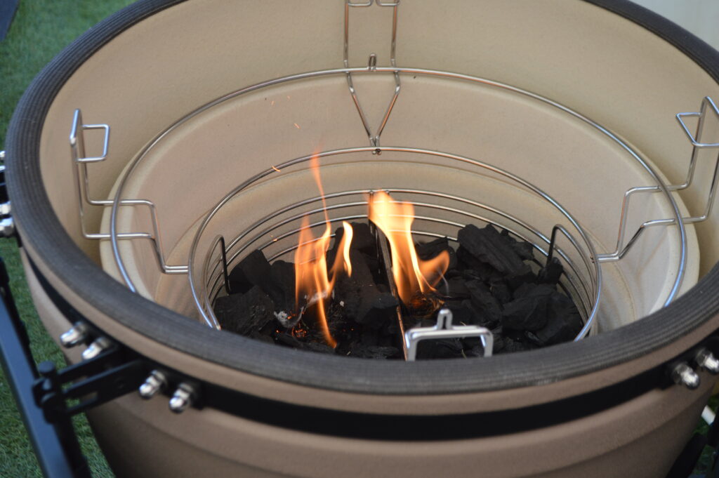 Dan wordt mijn favoriete buurman ingeschakeld, en zo wordt de kamado gemakkelijk in het onderstel geplaatst. Echt even met 2 man doen. Alleen is dit serieus af te raden! De Kamado zit stevig in het onderstel geklemd en dan is het een kwestie van ‘m goed centreren. Mooi in het midden plaatsten en niet meer aankomen dus. Wanneer we de Aslade in de vuurschaal willen plaatsten is het even opletten. Deze wordt normaal gesproken van bovenaf erin geschoven. Een makkelijke handeling, echter laat het heel veel ruimte vaak over. Hierdoor komt er as op plekken waar je niet even gemakkelijk bij kan, Bij de Urban Chef is ook hier over nagedacht. Want we moeten de aslade een beetje inknijpen zodat deze nét even wat smaller wordt, om hem vervolgens vanaf de onderkant naar boven te plaatsen. De stevigheid van de aslade zorgt ervoor dat hij zich weer volledig uitzet en we zien direct wat het gevolg is, namelijk een perfect afgesloten geheel.